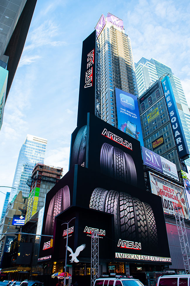 Arisun Tires has recently unveiled billboards in New York’s Times Square. The tire maker will showcase its brand through the sprawling 25-story, 15,000-square-foot building side LED display wrapping around the American Eagle store as the second launch at the heart of Times Square in New York.